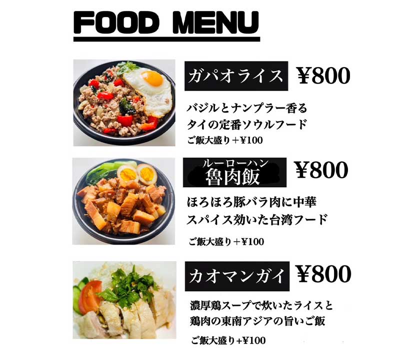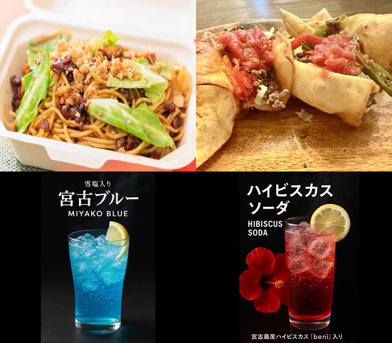 磯香る!木更津焼きそば、宮古島産ほろ酔い牛タコス、スタミナイカ焼き、宮古島ブルーソーダ、宮古島産ハイビスカスソーダ、宮古島の発酵物語ミキソーダ