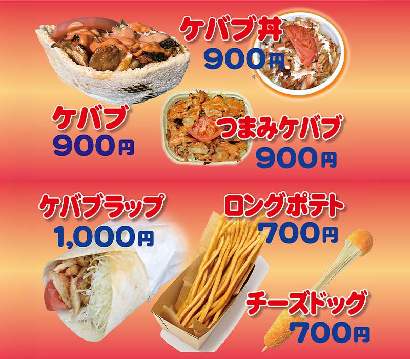 ケバブ、ケバブ丼、ケバブラップ、ロングポテト、チーズドッグ